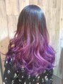 全体ブリーチ1回毛先は2回から3回すると綺麗な色になりやすいカラーになります。根元は暗髪のグレージュに染めて毛先は淡めのピンクにし、ハイライトでパープルのカラートリートメントを入れました。ダメージが気になる方はケアブリーチがオススメです。