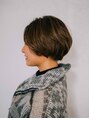 丸みのあるマッシュボブのスタイルです!レイヤーがほぼ入っていないので重く見えがちですがボブのツヤ感とヘアカラーのハイトーンぐあいでとても透明感のあるショートスタイルになります!