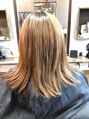伸ばし途中あるあるの肩ではねる状態をなるべく内に入りやすいように、顔周りに段をいれまとまりやすく調整♪そこに黄色味をキャンセルするようなグレージュをオン♪