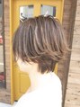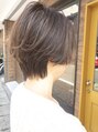 モデルさんは40代ですが年代問わず可愛いラフショートヘア。今が旬なセミウルフ☆カラーはマットグレージュ。ハイライト履歴もあるので、色味に動きが出ます♪ 巻くと◎