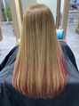 毛先を重ためにカットしコテで無造作感がでるように巻いて仕上げました★カラーは内側に細くハイライトを入れ全体は赤味を抑えつつ透け感が残るようにアッシュベージュ系のカラーで染めました★柔らかい印象に仕上がります!!