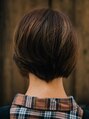 全体のウェイトがバックの高い位置にある前下がりのボブスタイルです。表面にハイライトをランダムに入れることで、立体感をだし、よりフェミニンな雰囲気に仕上げてあります。初めてショートスタイルにする方にもおすすめのスタイルです!【瀬田】