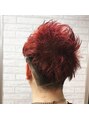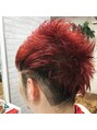 サイドからネープにかけて刈り上げスタイル。お客様ご要望の3ブロックスタイルです。ダブルカラーであざやかなレッドカラー。ワイルドショートに仕上げまた!