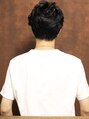 耳周り、襟足をスッキリ短くしたツーブロックショートスタイル。前髪は七三分けで上げて横に流せる様に、トップは高さが出る様に長めでレイヤーを入れ全体的に緩めにパーマをかけて立体感を出しています。
