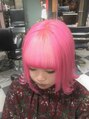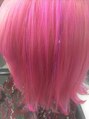 ブリーチリタッチ後、2色のピンクをON。インナーと前髪の先ちょっは濃い目のピンク、上のセクションはベービーピンク。きらきらティンセルエクステをポイントで装着。