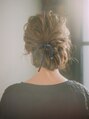 ゆるめにまとめたシニョンが可愛い。下めにまとめることで落ち着きのある大人の女性らしさを演出。首元がすっきりしていてどこかしらセクシーに。崩しを多めにいれてふわふわなアレンジにしてみました。リボンで女の子らしさUP☆