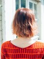 肩につかないくらいのロブ。ワンレングスベースでトップにレイヤーを入れたスタイル!バングを目の上でワンカールで目元を強調させました。カラーは一度グラデーションに色を抜いてからオンカラーで暖かみのあるコーラルカラーにしました!