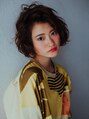 ボブスタイルですが、首のラインがスッキリ見えて、小顔効果も抜群なスタイルです!!大胆なパーマが可愛らしさアップさせます。バングはあげることで甘さと辛さのめりはりがついてgood!!カラーも明るめがキュートですね☆