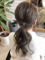 結ぶ位置を低めにしたポニーテール。ゆるくコテで巻き、柔らかさをプラスしたら!!落ち着いた大人の女性に仕上がりまよ。さらにベージュ系のカラーには様々な種類があり印象も変わり楽しめますよ。
