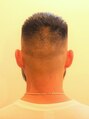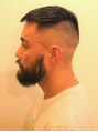 横分けなどのバーバースタイルが飽きたらこれ。タフな大人と前髪のギャップが新しい。特徴は前髪パッツン下し(前髪はもっと重めで強調しても良い)。刈上げ部分は高めのハイフェード。厚みは0.8mmからのスキンフェード!