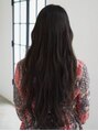 腰のあたりまであるSUPERロングに眉上バングがモードな印象。さらにバングをカールさせ、個性的に。ダウン部分には緩やかなウェーブをプラスしました。