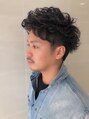 黒髪ソフト2ブロックのアップバングパーマヘア