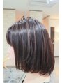 ビフォーの写真を見てもらうと分かるのですが、毛先につやがなく退色感が強いです。縮毛矯正履歴あり。希望が暗めでツヤも出したい。Ferieで今人気のグロスカラーを使用。暗めピンクラベンダーカラーで染めました。