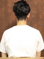 耳周り、襟足をスッキリ短くしたツーブロックショートスタイル。前髪は七三分けで上げて横に流せる様に、トップは高さが出る様に長めでレイヤーを入れ全体的に緩めにパーマをかけて立体感を出しています。