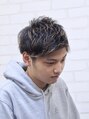 サイドにツーブロックを入れ、襟足は刈り上げにしスッキリ王道アップバングショートです!メッシュを入れて動きを表現!