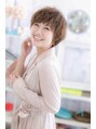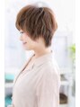 トップにふわっとボリュームを持たせ、厚めの斜めバングと合わせて丸みを持たせた女の子らしいショートスタイル。えりあしをスッキリまとめて清潔感も好感度もUP。明るいベージュカラーやグラデーションカラー、3Dカラーで外国人風の仕上がりがグラマラス。