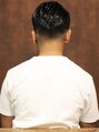 アウトラインを短く刈り上げたベリーショートスタイルです。サイドパートでパートラインを作り、横に流せるようにトップはやや長めに切ります。短い所とトップとの長短をつけてメリハリのあるスタイルにしています。