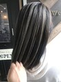 ベースは6レベルのグレーアッシュでしっかり色味を濃く、さらにプレックス配合ハイブリーチで細かくハイライト後、一度シャンプーで流してからハイライト部分にのみ薄くモノトーングレーで色入れ。外国人風スタイル。