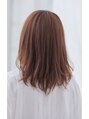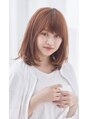カットはあご下のひし形シルエットの大人かわいいミディアムスタイル。全体的に重くなりすぎいないよう量をすきました。前髪は、斜めバング。コテで巻いた時にひし形になるように表面に段差を入れ簡単スタイリングスタイルに。似合わせカット、小顔、大人ボブ