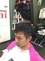 フロントに流して軽いカールを付けたツーブロックスタイル。立ちやすくまとまりずらい髪毛を形状記憶パーマでセットしやすいスタイルに。