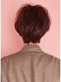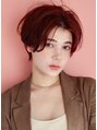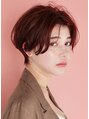センター分けのハンサムショートです。全体をピンクブラウンでカラーリングして、毛先にワンカールのパーマをかけています。これからの夏のシーズンにぴったりのスタイルです。