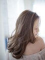 ゆるいウェーブ感のあるロングスタイルです。表面にハイライトをいれているので、少し巻くだけでも立体感がでるようにしています。ノーバングで大人らしさを出しつつも、Aラインのスタイルなので、女性らしいフェミニンさも出せるスタイルです