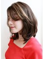 ブラントカットのロブスタイル。グラデーションベースにデジタルパーマではなくコテでワンカールの巻き髪。