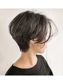 顔まわりの長さを残しアレンジの幅を広げ、カラーは極細ハイライトを全体に散りばめたハンサムショート。オイルやワックスをもみ込むだけでキマります。