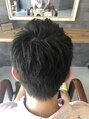 メンズのショートスタイル。えりあしをタイトにしめて、トップにボリュームが出るようにカット。束感が出るようにセニングを入れ、セットしやすいように。