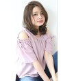 肩ラインの軽いレングスであえて重ためでカット!32ミリのコテでワンカールで巻いただけのスタイル。カラーを透明感のあるブルージュでカラーオン!カットで重く、カラーで軽く重軽ミックスのバランスがグッド!