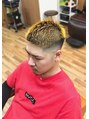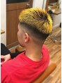 ブリーチ後の金髪にイエローを被せたファンキースタイル!根元の黒を残すのがポイント♪スキンフェードとの相性もバッチリ☆[ツイスパ/ツイストスパイラルパーマ/ツイストパーマ/スキンフェードカット/ホワイトハイライト/ハイライト/プードルパーマ/眉毛]