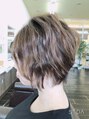 前下がりのショートボブスタイルにワンポイントで無造作な動き。