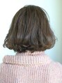前髪なしのボブスタイルです。流れる前髪と中間からのカールの動きが特徴的なスタイルとなっています。コールドパーマでゆるめのパーマをかけてニュアンスの動きをつけて柔らかさを出しつつはトップはふんわりさせてエアリーな質感に。【イオン八戸田向】