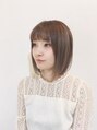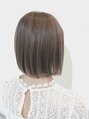 ハイライト、その上からホワイトベージュをオンカラー。シャープすぎないよう優しく前下がりボブにカット。