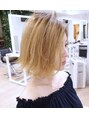 肩上で切りっぱなしにカットし表面だけにレイヤーを入れ束感が出るようにし全体に軽さをいれ柔らかい外ハネスタイルに!カラーはゴールドカラーで外国人風の色味にしました。「ブリーチが必要な施術の色味になります」