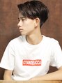 アウトラインを短くツーブロックにした七三ショートスタイル。パートラインを目の外側ぐらいで決めて七三に分け、トップと前髪をやや長めに残す事で毛流れができやすくしています。