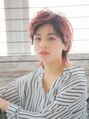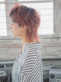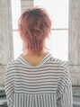 ブリーチオンカラーで少しレトロ感のあるコーラルピンク系のお色をのせました。顔まわりは地毛のお色を残し、引き締め小顔印象に!! カットはウルフ系でハイレイヤーをいれて、首回りはすっきり。 バングもかき揚げ風でかっこいい印象に。