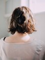 肩上アゴラインで重めにカットされたボブスタイルです♪後ろ髪はしっかりとカール感のあるスタイルで!前髪はショートバングで斜めに、毛先に透け感をいれて全体的に躍動感のあるかんじに!前髪を斜めに分けて肌感を出すことでメリハリのあるスタイルに!