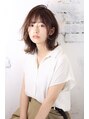ラフに動く外ハネの毛先で遊びをつけたミディアムスタイル。レイヤーでつくったくびれフォルムと透明感バツグンのベージュで柔らかさをプラス。前髪は目の上ラインのシースルーバングで今っぽさと大人感をアシスト◎