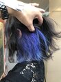 赤みを消したダークブルーアッシュにインナーカラーで鮮やかなアクアブルーを入れてます!巻いたり動かしたり、縛ったりすると見えてオシャレです!