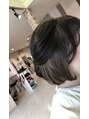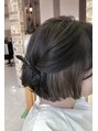 ボブスタイルにインナーカラーを用いてあります。根元は白髪をカバーしつつ、ベース全体はモスグリーンの色合いで作ってあります。インナーカラーの部分は一度ブリーチしてからグレージュをON。お仕事の時は、編んで隠せる位置を遊びのカラーにしてあります