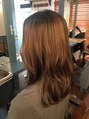 年代関係なく、誰にでもフィットしやすいブラウン、ベージュ系のカラーです。根元はあえて4.5センチ外してブリーチのハイライト、地毛くらいのダークトーンをランダムに入れてあります。中間色は8トーンです。