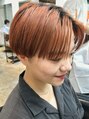バック刈り上げ、サイドツーブロックのハンサムショート、根元の黒い部分を残してブリーチして、オレンジでカラー。