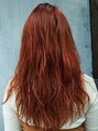 パキッとしたオレンジヘアを縦巻きではなくウェーブにすることによって、今っぽいスタイルに。前髪をかき上げることで格好良さも◎