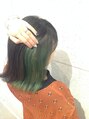 流行りのインナーカラー。あえてトップは暗めのお色にする事でよりインナーの緑を際立てました。インナーカラーは1度ブリーチをしているので、色が抜けてきたら違う色に染めることもできるますので長く楽しめます。