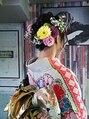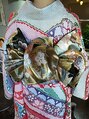 振り袖スタイルです!!生花を飾りとしてたっぷりあしらって華やかなヘアースタイルです!!帯も華やかな結びで可愛らしく華やかにしあげてます!!
