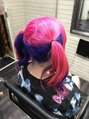 ブリーチした後、インナーを青紫に上をピンクにしてツインテールでフィニッシュ!!前髪、姫カット部分にもひっそりと青紫ちゃんおります~