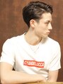 アウトラインを短くした七三ショートスタイル。パートラインを目の外側ぐらいで決めて、ピッチリ七三に分け、トップをやや長めに残す事で毛流れができやすくしています。