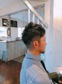 メンズのツーブロックショートスタイル。後頭部に丸みを出し、前髪を下ろしているので、マイルドな印象となっています。