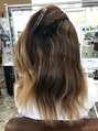 ハイダメージブリーチ毛。顔回りのハイライトの細い毛、新生毛のバージン毛、中間のカラー毛とハイライト。3種類の酸性縮毛矯正剤を使って、上手くいきました。